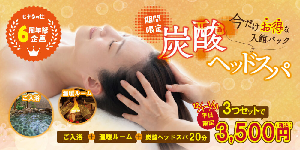 日頃からほっとりらく北屋をご利用頂き、誠にありがとうございます。今夏から大人気の炭酸ヘッドスパ!今回は、日頃の感謝を込めて「入浴+温暖ルーム+炭酸ヘッドスパ」の3つをセットにして、スペシャルな入館パックとしてご準備させて頂きました。身体をしっかり暖めてヘッドスパでスッキリしてみませんか?ご予約お待ち致しております!